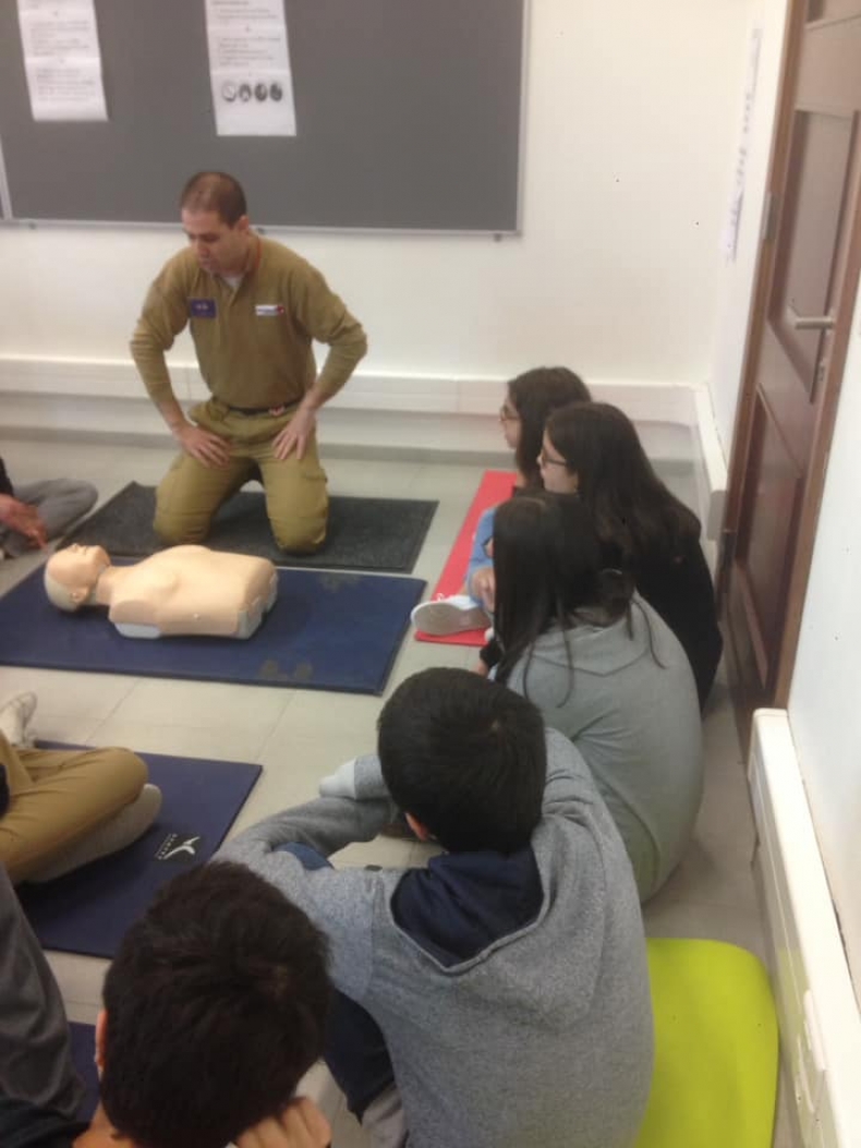 Hoje, 9 de janeiro, continuámos na Escola Secundária Infanta Dona Maria, com mais duas turmas do 9.º ano, a sensibilizar para o Suporte Básico de Vida, ensinando sobre a importância da cadeia de sobrevivência, instruindo sobre a abordagem à vítima e treinando inúmeras situações com os manequins relacionadas com o tema.